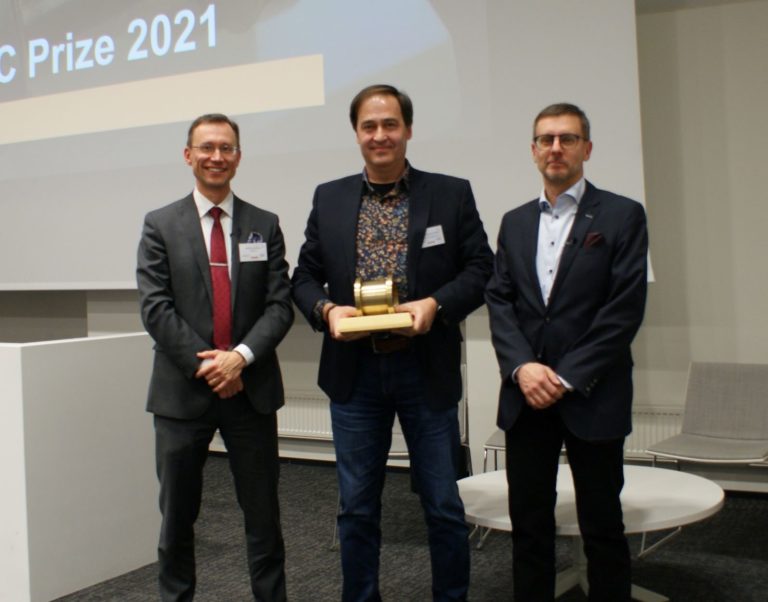 DIMECC CEO Harri Kulmala (left) and Program Manager Seppo Tikkanen (right) awarded the DIMECC Prize 2021 to Brighthouse Intelligence’s Managing Director Markku Sahlström (center).